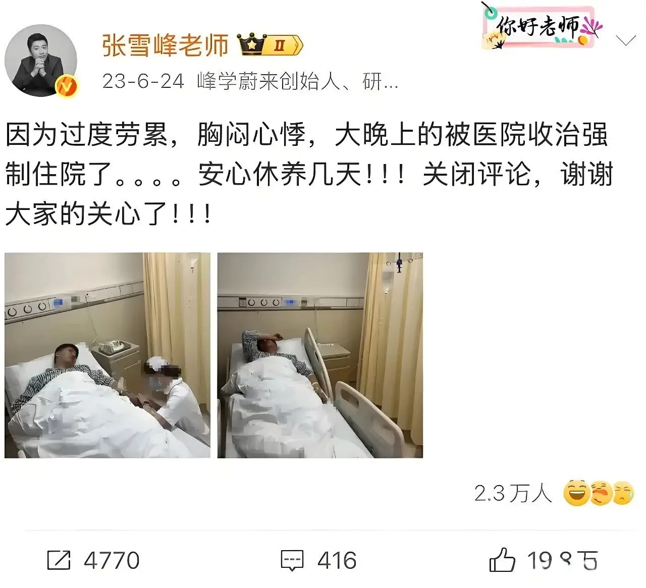 2023年6月24日,张雪峰因劳累过度,出现胸闷、心悸症状。妻子陪他去医院看病。