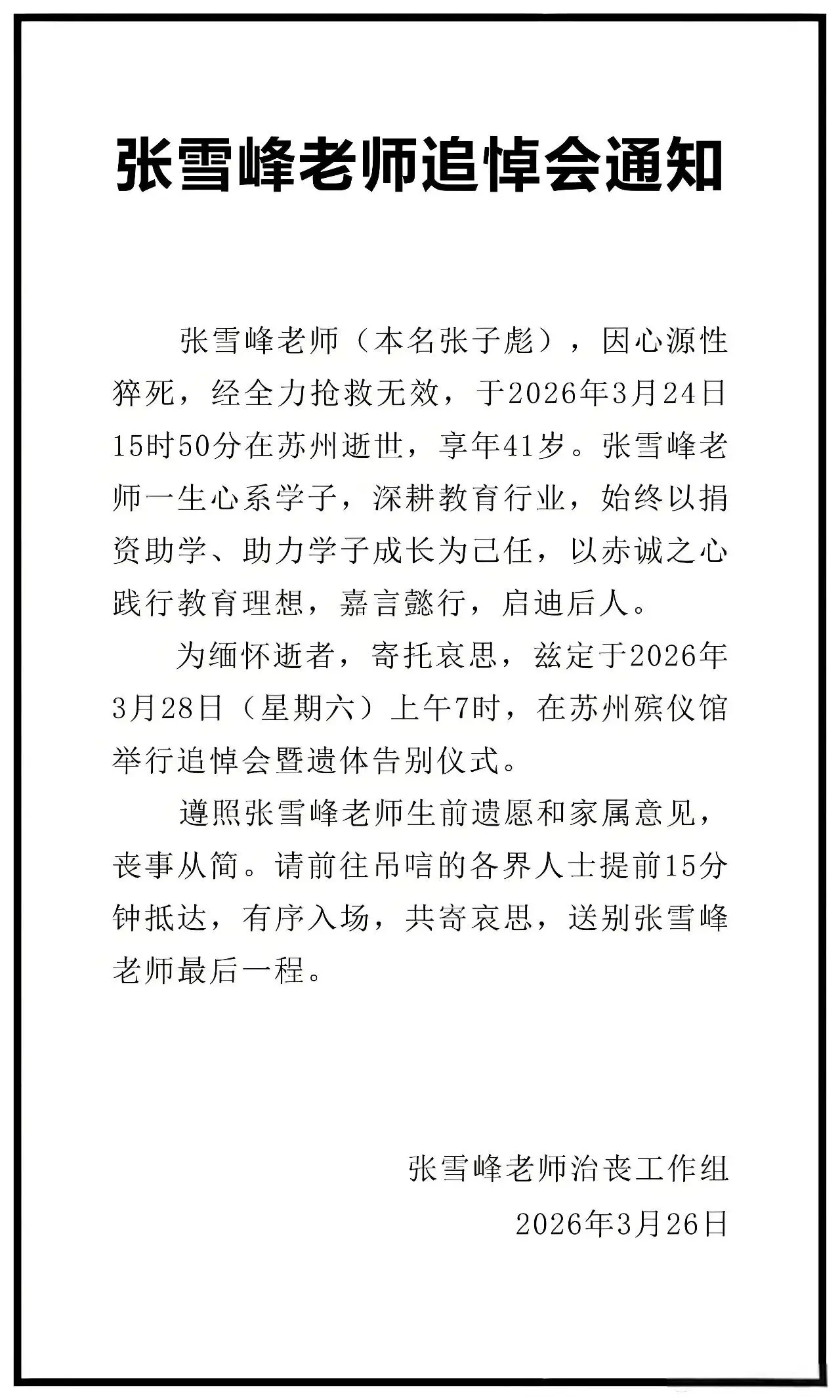 2026年3月,张雪峰的追悼会暨遗体告别仪式,在苏州殡仪馆举行。