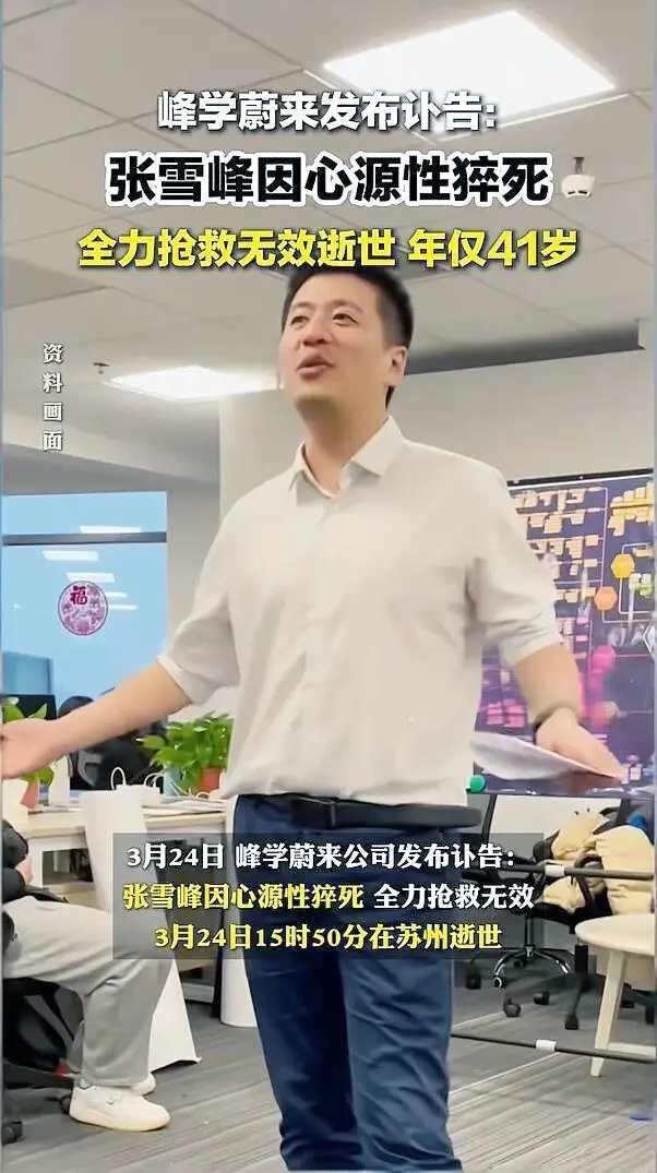 员工将他送医后,院方全力施救也没能将张雪峰抢救过来,他不幸因心源性猝死离世,年仅41岁。